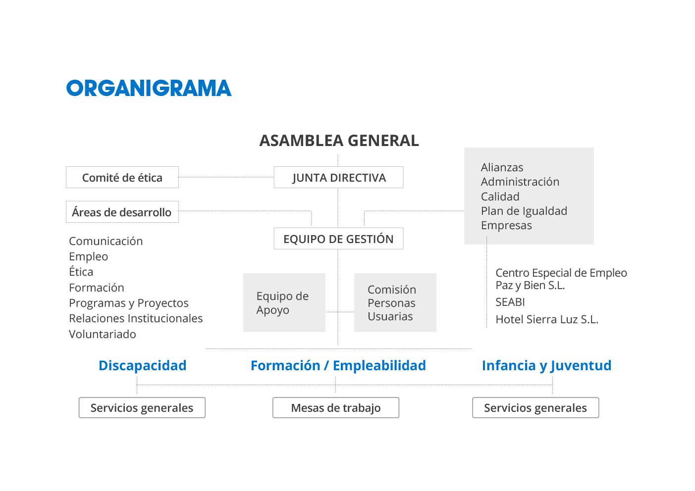 La Asociación Paz y Bien presta servicios a más de 720 personas –distribuidas en 36 centros ubicados en Sevilla, Huelva y Quezaltepeque (Guatemala)-, que cuentan con la aportación de más de 310 profesionales y más de 100 personas voluntarias. Su objetivo es ofrecer un servicio de calidad y responder a las necesidades y expectativas vitales de las personas usuarias.
